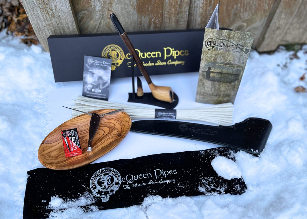 该套装将包括我们配套的新支架和捣固器(缠绕在麻芯中)、每包 50 个烟斗清洁器、礼品套装、烟斗工具和我们的新皮革烟草袋。
